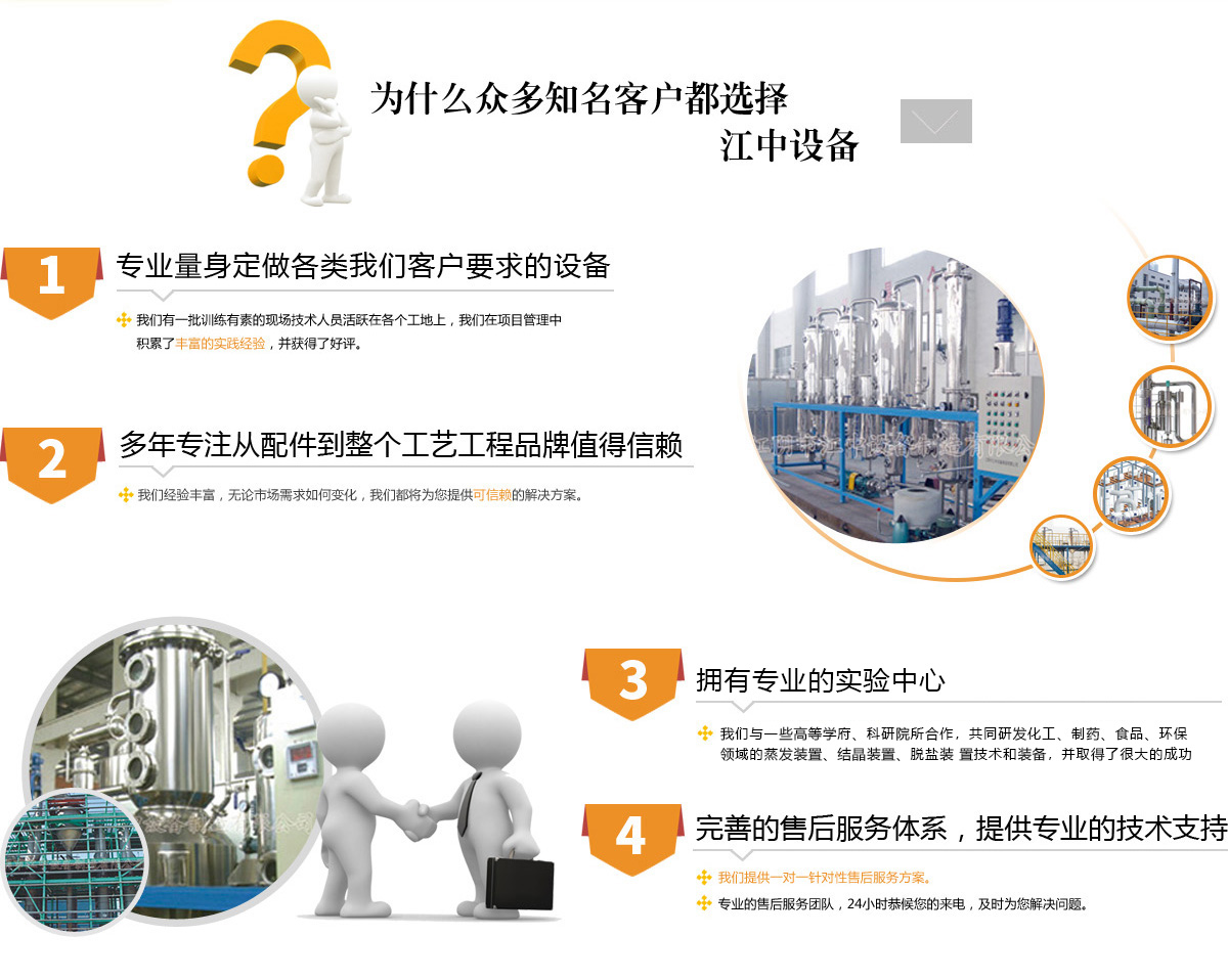 江陰市江中設備制造有限公司是一家專業從事蒸發、濃縮、提取、污水處理等設備的廠家。廣泛應用于制藥、化工、食品、農副產品深加 冶金、電子等多個領域。產品遍及全國三十余個省、市、區,并遠銷歐美及東南亞一些國家和地區。公司實力雄厚,匯聚了一批高層次、高素質 的專業人才,一直致力于產品的開發、生產和管理,并十分注重科技創新,所生產的設備受到用戶的青睞。
